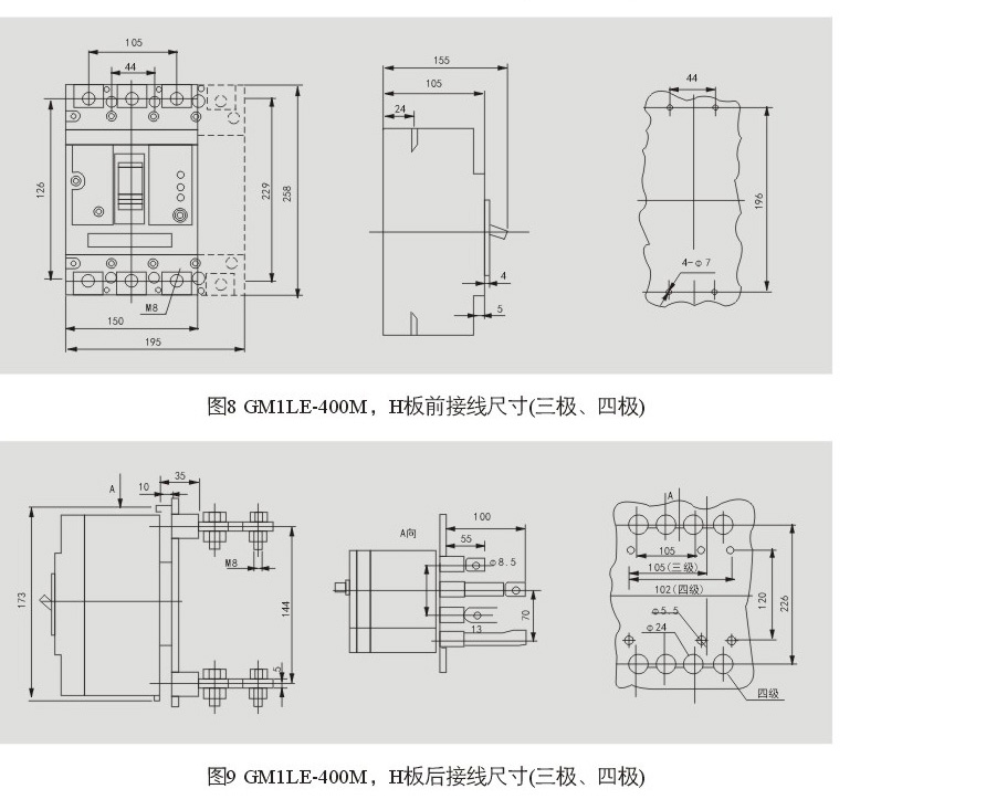 如訂GMILE.I00四極,額定電流為50A , 額定漏電電流型式為延時,帶轉動手柄操作機構,帶漏電報警單元模塊,旦且工作在方式一,中性極類型為A型,分勵脫扣器(AC00V),板后接線20臺。既寫為GMILE.I00z!4310AI,IN=50A ,額定漏電電流為50mA , 分勵脫扣器AC4OOV ,板后接線20臺。